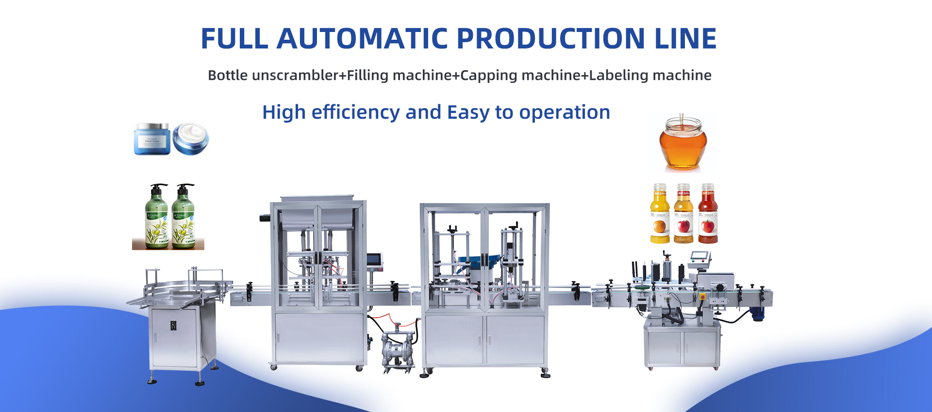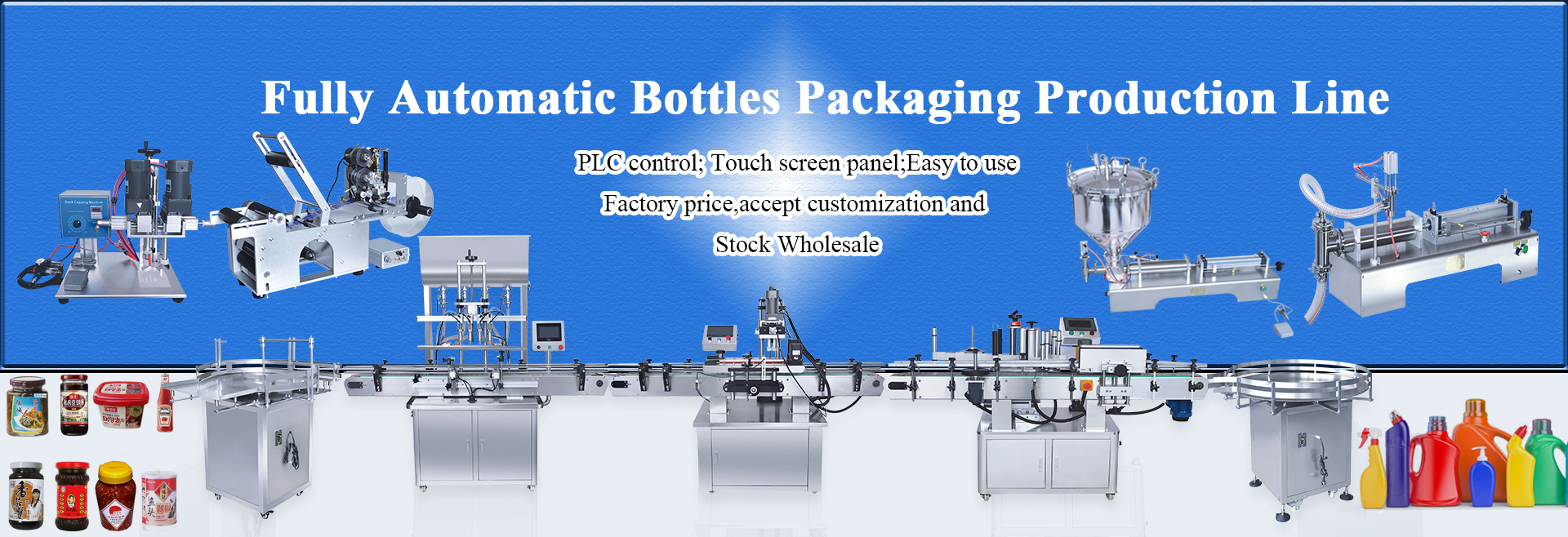 Bottle feeding table + filling machine + capping machine with cap feeder + labeling machine + bottle collecing table