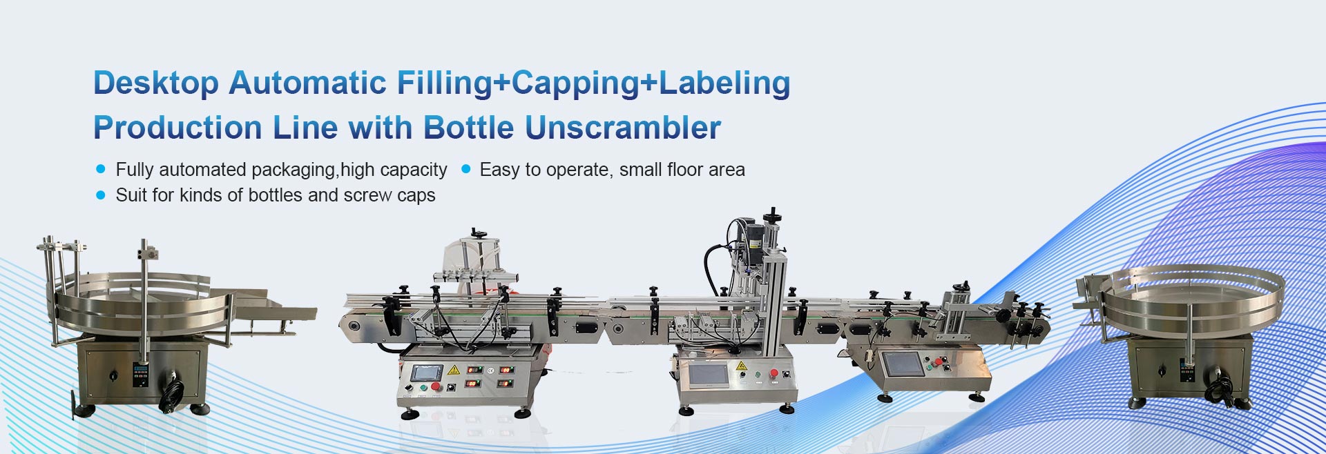 Desktop liquid filling capping labeling for small bottles with round bottle feeding and collecting tables