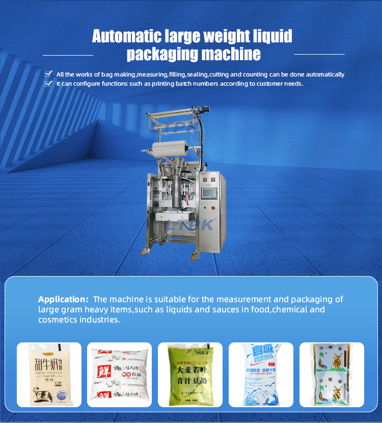 The machine is suitable for the measurement and packaging of large gram heavy items,such as liquids and sauces in food,chemical and cosmetics industries.