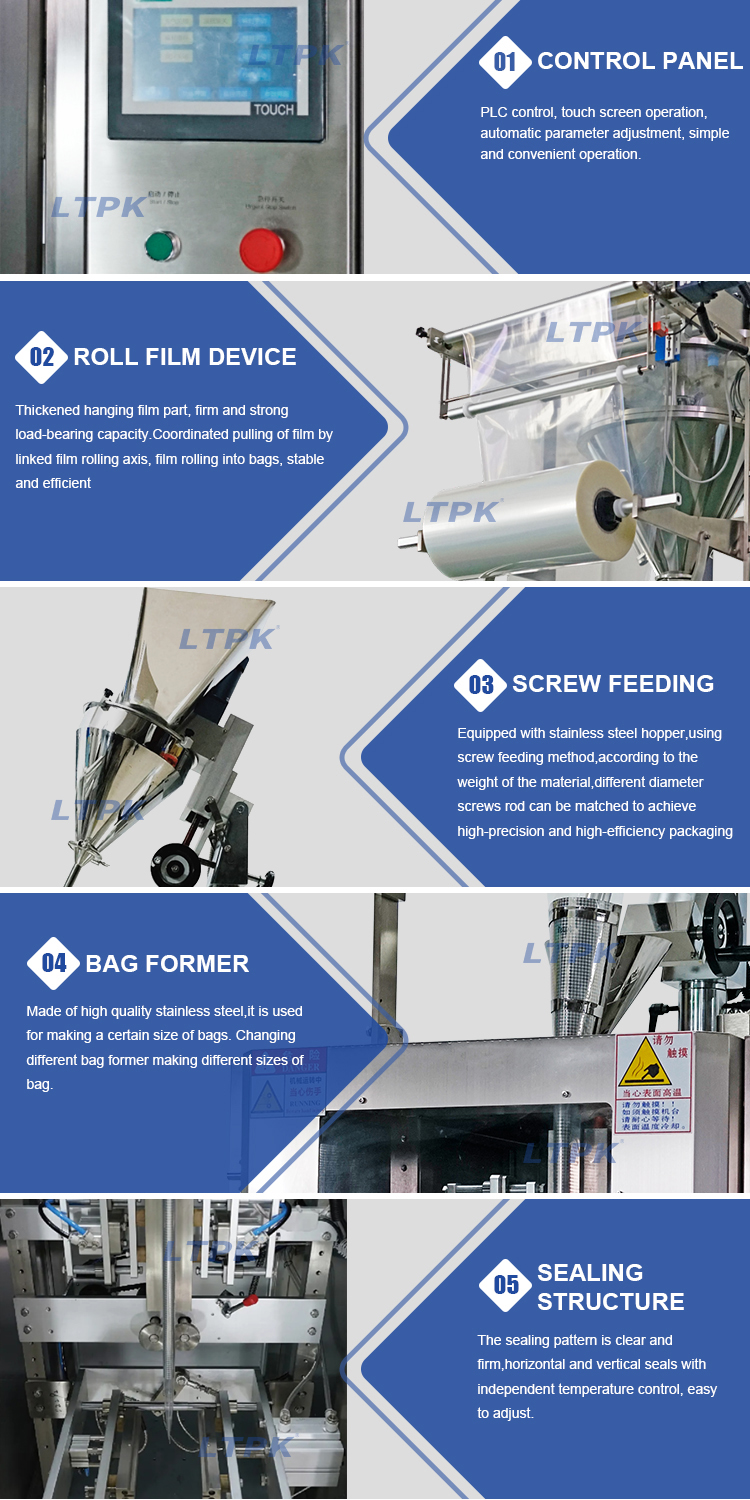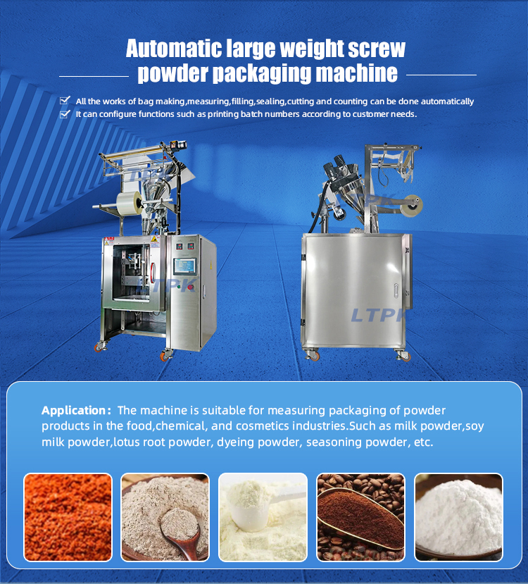 The machine is suitable for measuring packaging of powder products in the food,chemical, and cosmetics industries.Such as milk powder,soy milk powder,lotus root powder, dyeing powder, seasoning powder, etc.