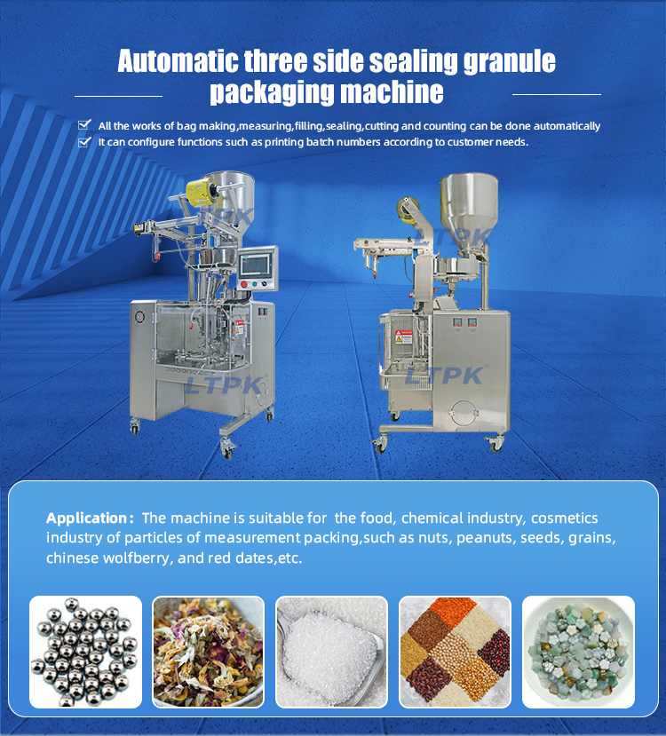 The machine is suitable for the food, chemical industry, cosmetics industry of particles of measurement packing,such as nuts, peanuts, seeds, grains, chinese wolfberry, and red dates,etc.