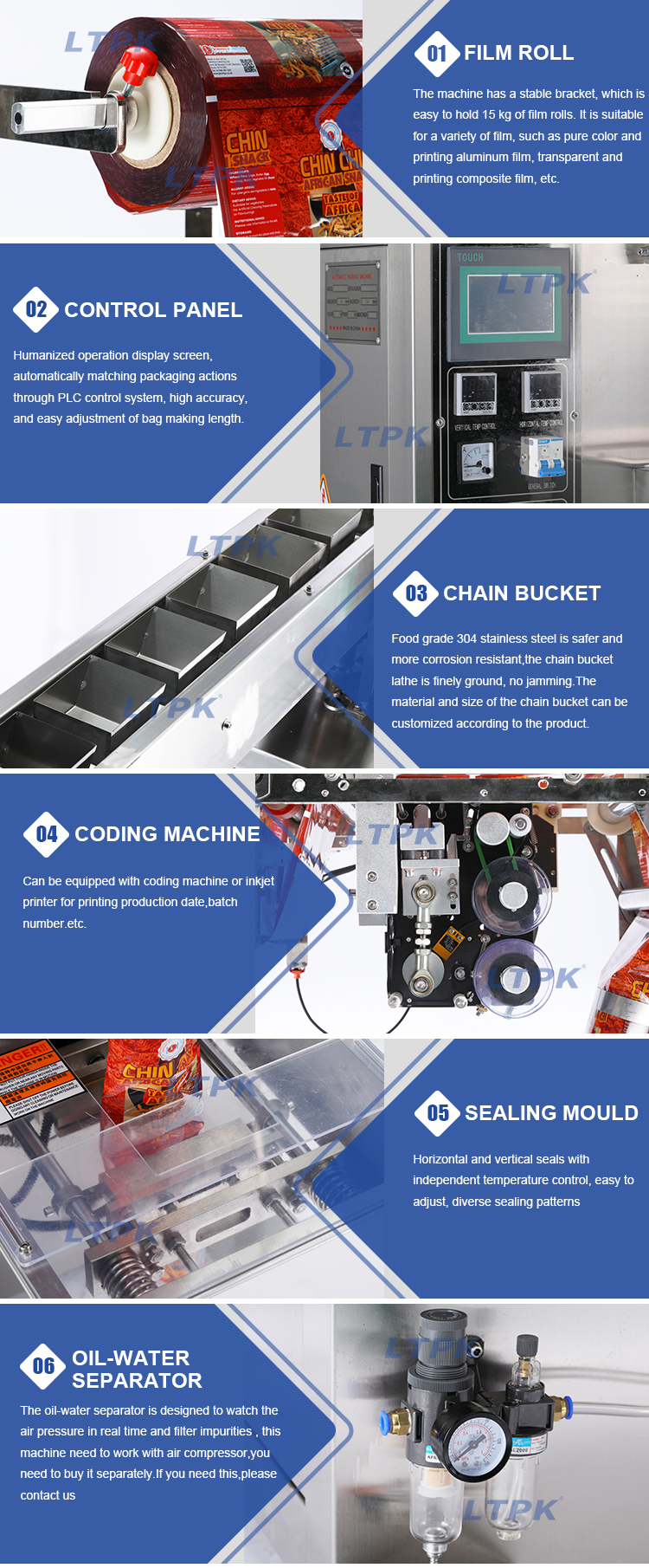his machine integrates mechanics and electronics, with a dual CPU microcomputer control system and full Chinese display. It adopts a microcomputer controlled photoelectric tracking correction system and is equipped with a high-precision stepper motor to accurately locate the same position of each packaging bag pattern. The control system completes the synchronization, fixed length, positioning, and speed of the whole machine. The CNC cutter 2-99 bags can be adjusted for automatic counting and cutting, and can automatically diagnose faults. Optional installation of coding machine and inflation device.