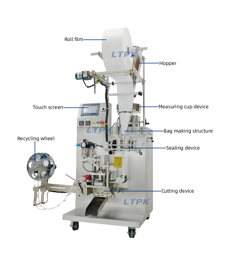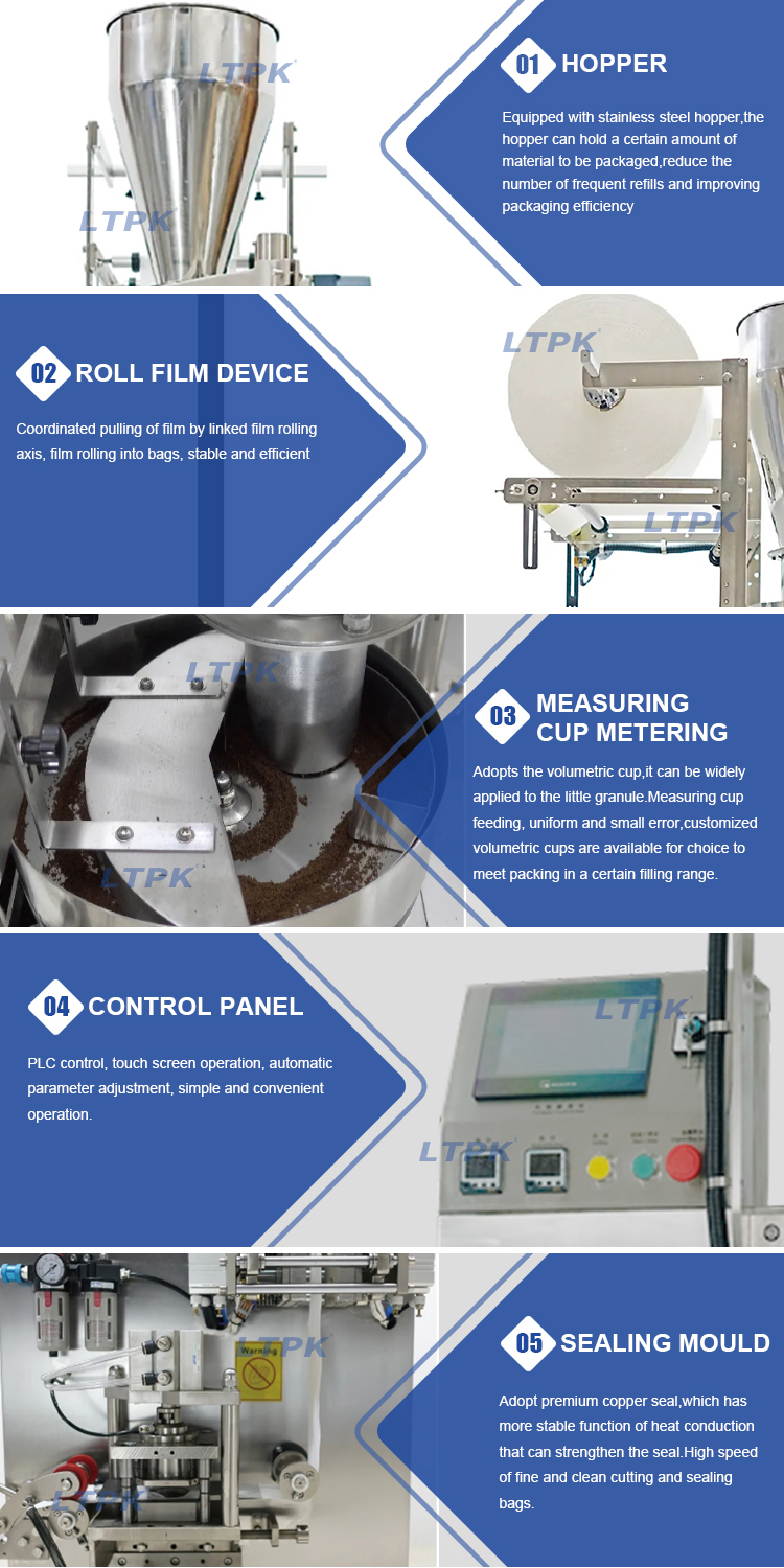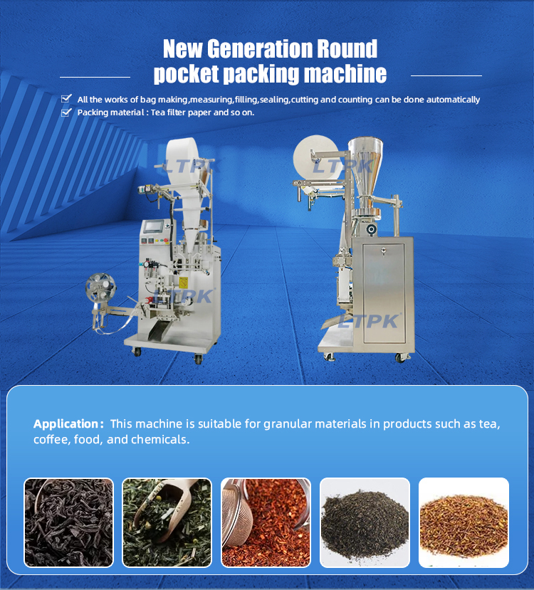 This machine is suitable for granular materials in products such as tea, coffee, food, and chemicals.