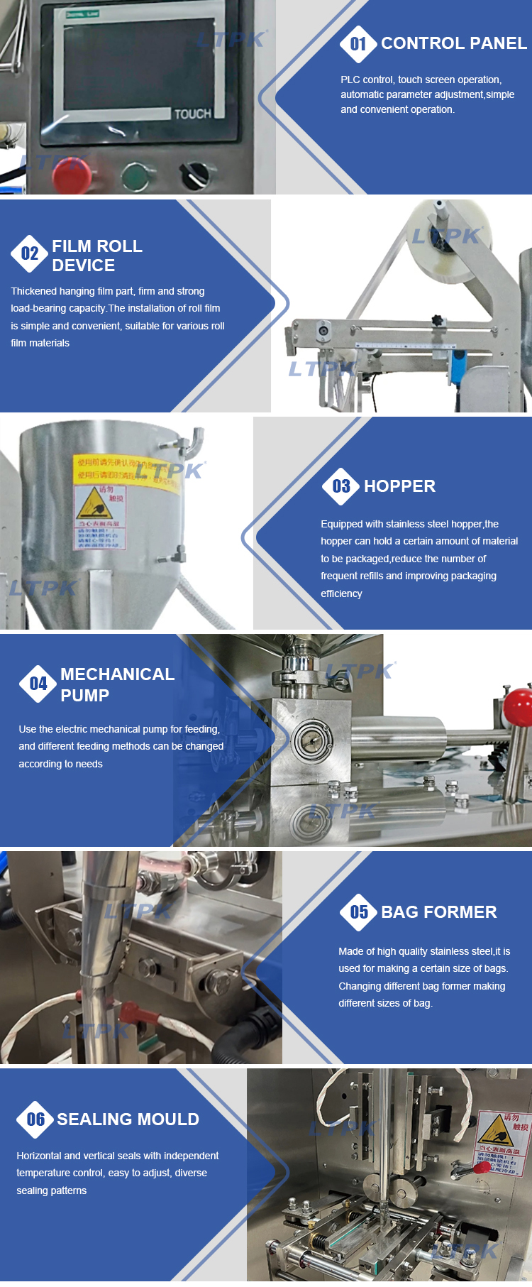 This machine adopts the touch screen operation, PLC control, drive stepper motor to control the bag length,stable performance,easy to adjust and accurate detection.Choose the intelligent temperature controller and PID control to ensure the error range of temperature controlled within 1 degree Centigrade.