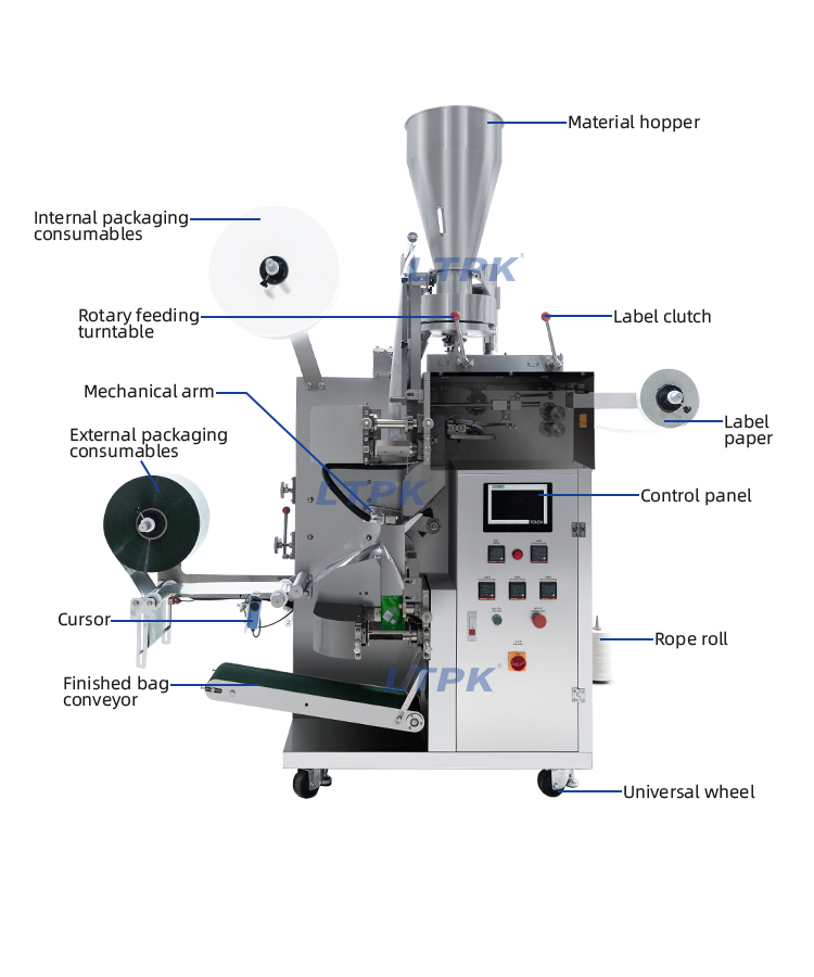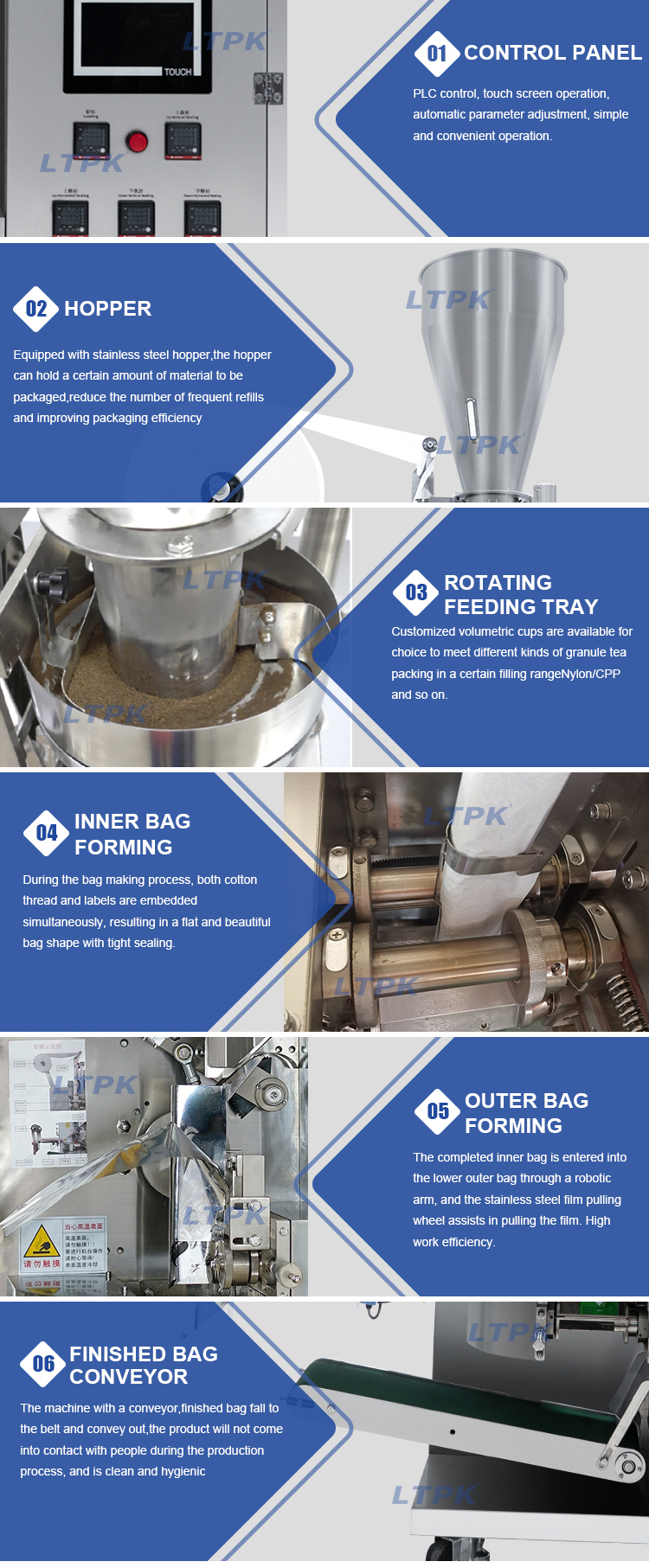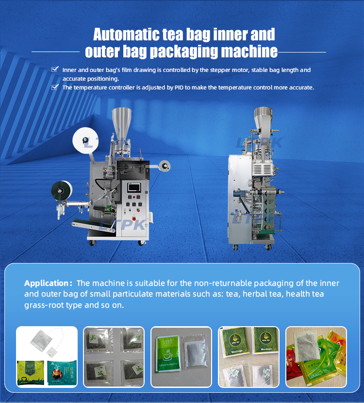 This machine is a new type of heat sealed, multi-functional fully automatic tea bag packaging equipment. The main feature of this machine is that the inner and outer bags are formed in one go, avoiding direct contact between hands and materials and improving efficiency.Adopting PLC control, touch screen operation, automatic parameter adjustment, simple and convenient operation.