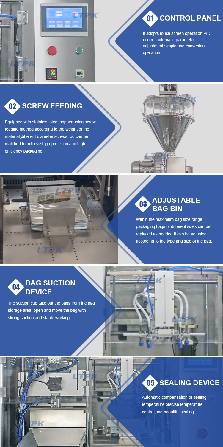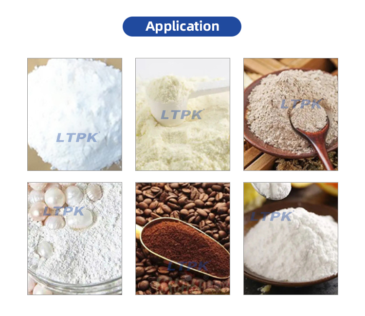 Suitable for large grams weight packaging of powders in the food, chemical, and cosmetics industries.Such as milk powder,soy milk powder,lotus root powder, dyeing powder, seasoning powder, etc.