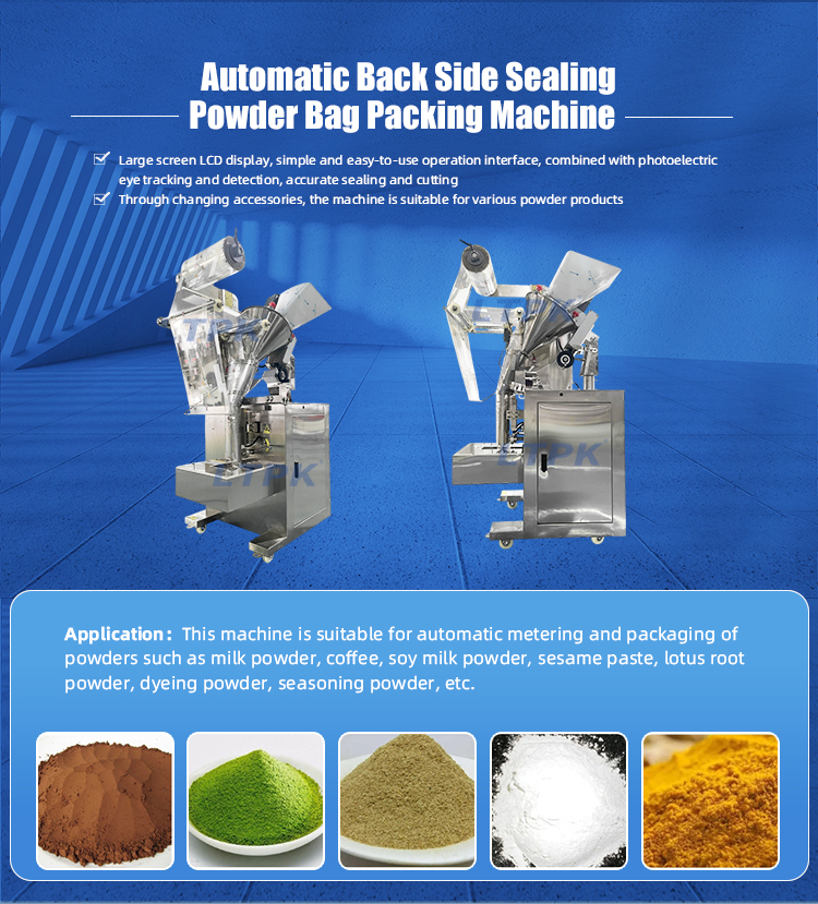 This machine is suitable for automatic metering and packaging of powders such as milk powder, coffee, soy milk powder, sesame paste, lotus root powder, dyeing powder, seasoning powder, etc.
