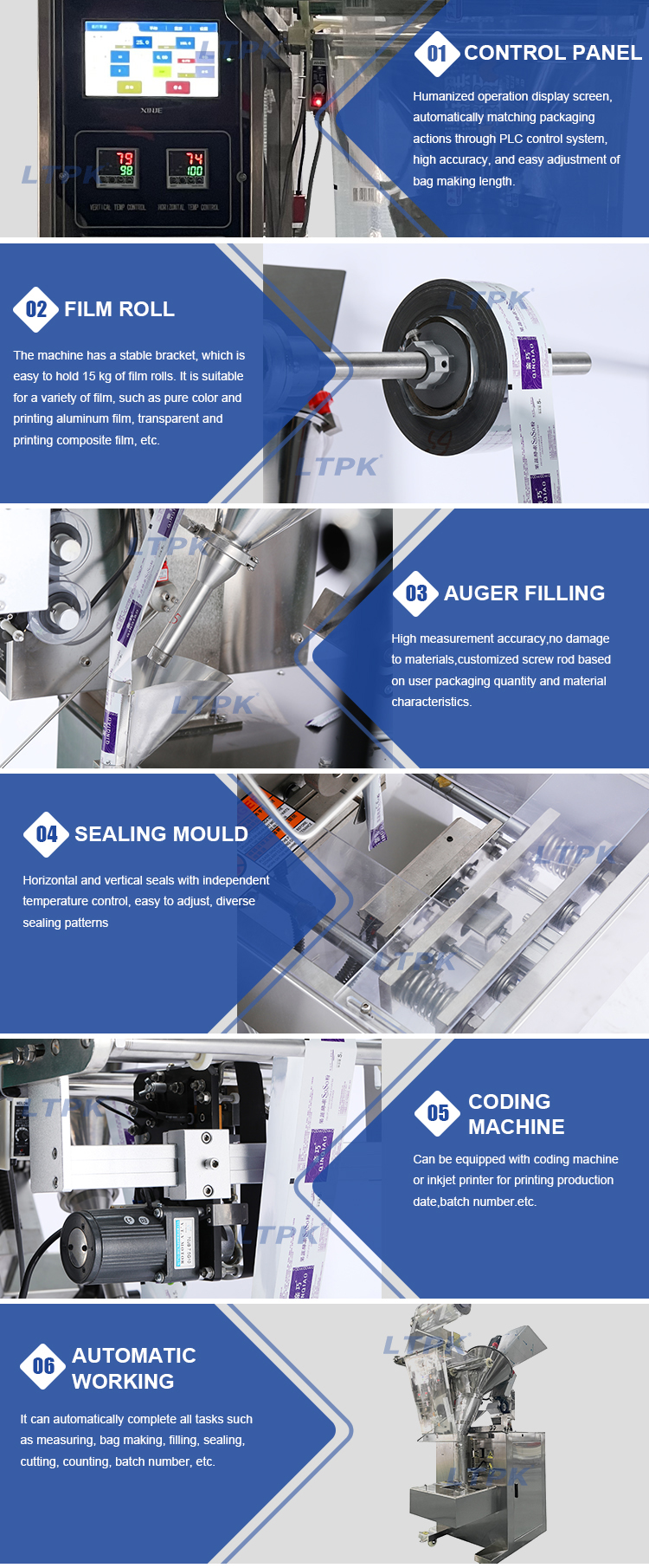 This machine is equipped with a dual CPU microcomputer control system, a 5-inch LCD display in Chinese or English, a user-friendly interface, automatic cursor detection and tracking, and simpler operation.Equipped with high-precision stepper motors to ensure the accuracy of cutting positions for each packaging bag.Adopting the inclined screw feeding method, the packaging weight can be directly adjusted during the packaging process without stopping the machine, effectively improving work efficiency