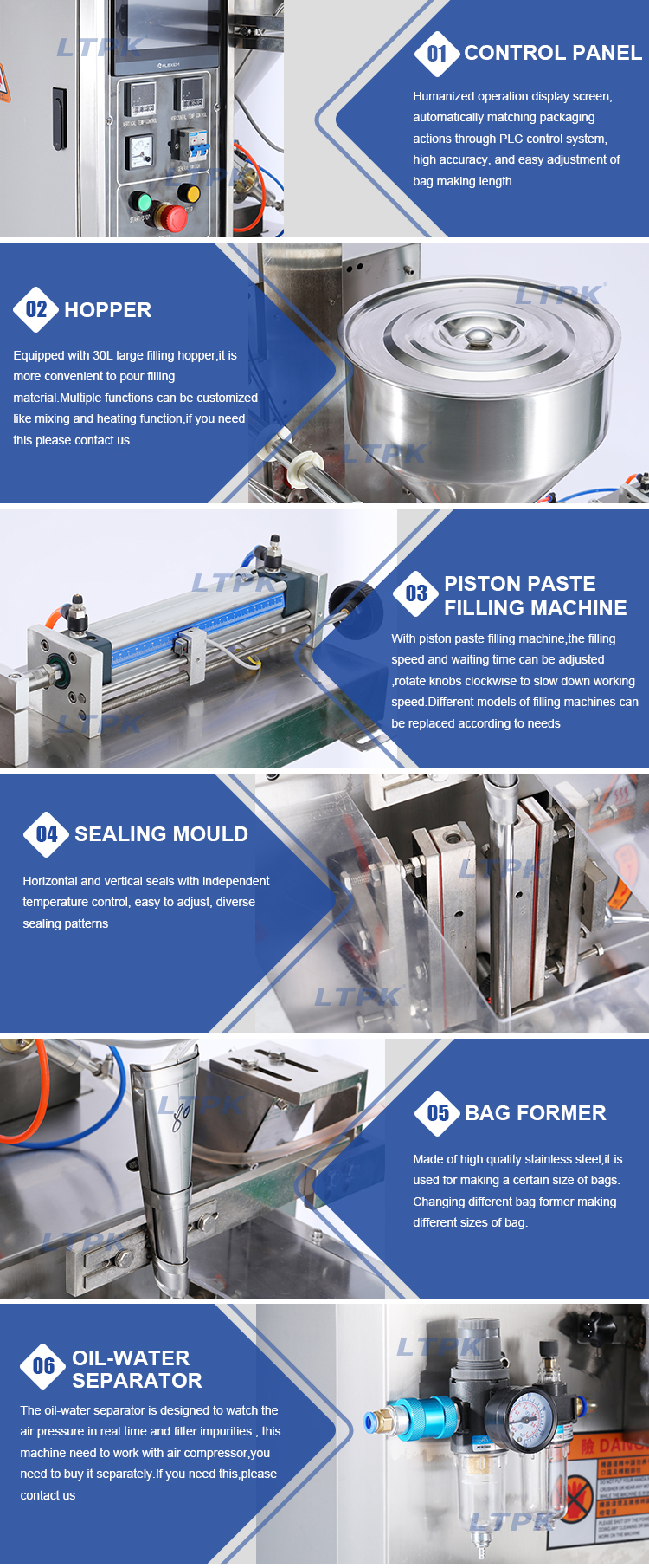 This machine is controlled by advanced microcomputer chips internationally, with a large LCD display and a simple and easy-to-use operation interface. It is equipped with photoelectric eye tracking and detection for accurate sealing and cutting. It can be optionally equipped with a coding machine, exhaust or inflation device. The parts in contact with the materials are made of high-quality 304 stainless steel to ensure that the materials are not contaminated during the working process and are easy to clean