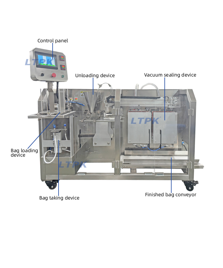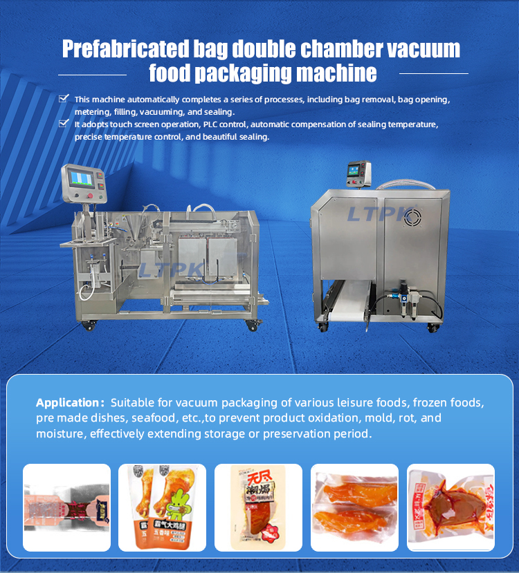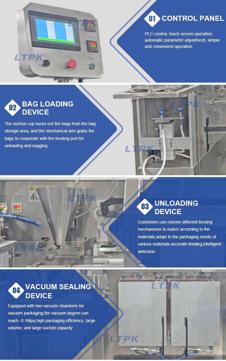 The whole machine has good reliability, simple operation, high packaging efficiency, large volume, and large suction capacity.The packaging process is fully automated and can be vacuumed (the vacuum degree can reach -0.1Mpa). Different cutting structures can be selected according to the properties of the filling material.