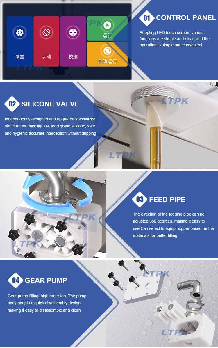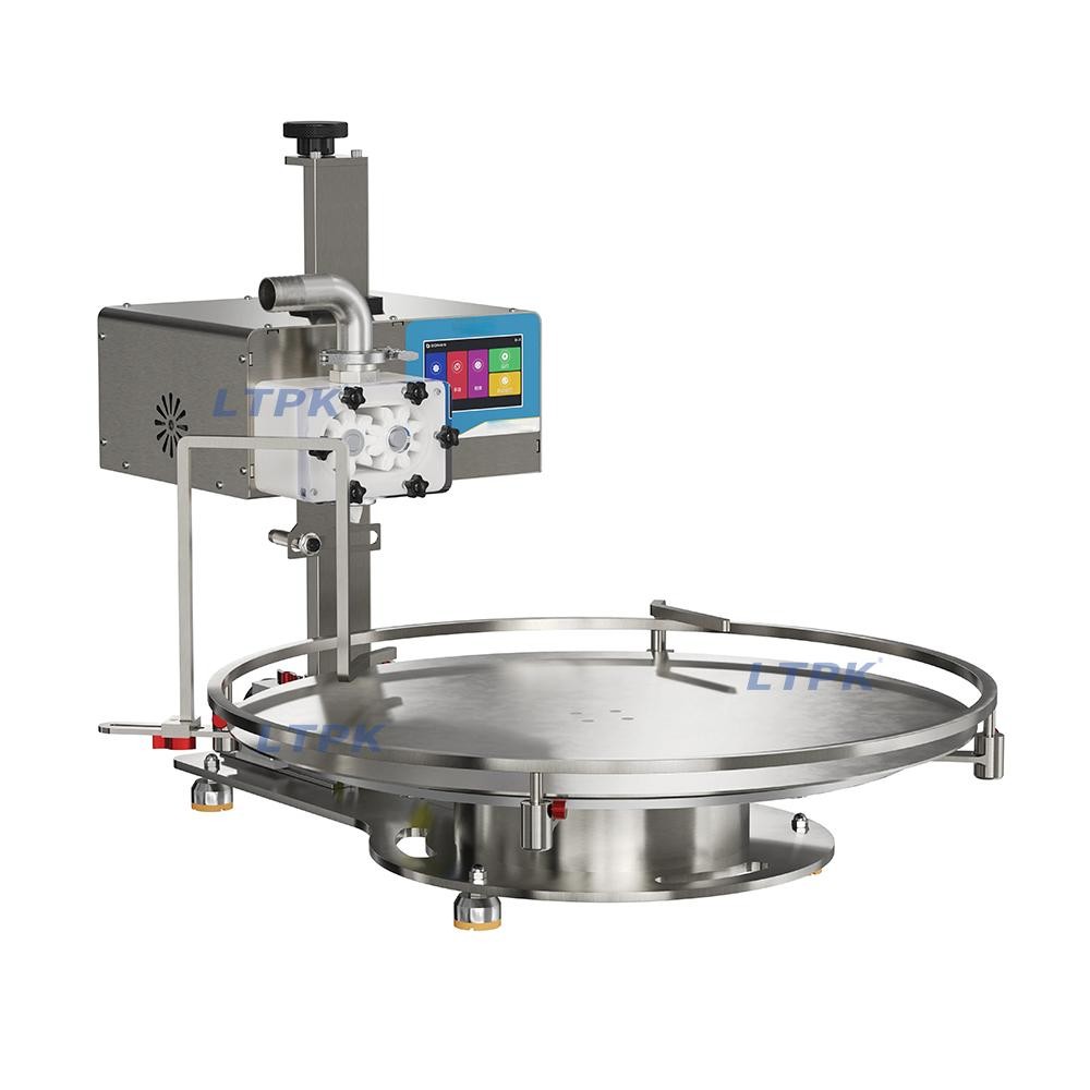 This filling machine uses a gear pump and is suitable for high viscosity liquids.It is equipped with an infrared sensing bottle system,the turntable and the filling machine work automatically in coordination, freeing up your hands. It can achieve small-dose container filling, with a minimum filling volume of 5g.Touch screen display, convenient for setting.
