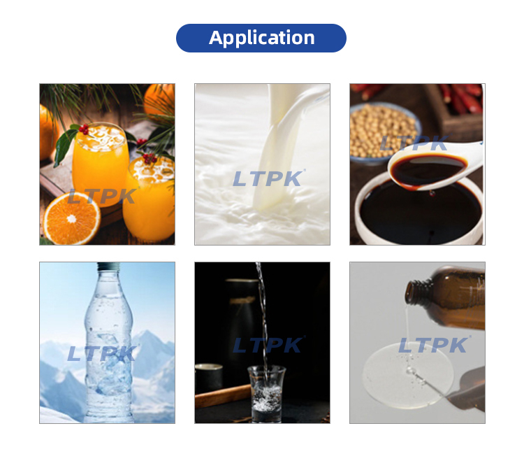 Wide range of application, filling of various liquids. Such as beverage, milk, soy sauce, alcohol, wine,oral liquid, essential oil, water, perfume etc. Suitable for various industries, such as food, chemical, catering, daily chemical, etc.