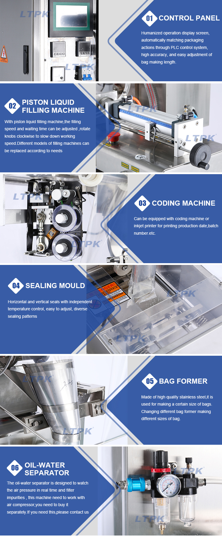 This machine is controlled by advanced microcomputer chips internationally, with a large LCD display and a simple and easy-to-use operation interface. It is equipped with photoelectric eye tracking and detection for accurate sealing and cutting. It can be optionally equipped with a coding machine, exhaust or inflation device. The parts in contact with the materials are made of high-quality 304 stainless steel to ensure that the materials are not contaminated during the working process and are easy to clean