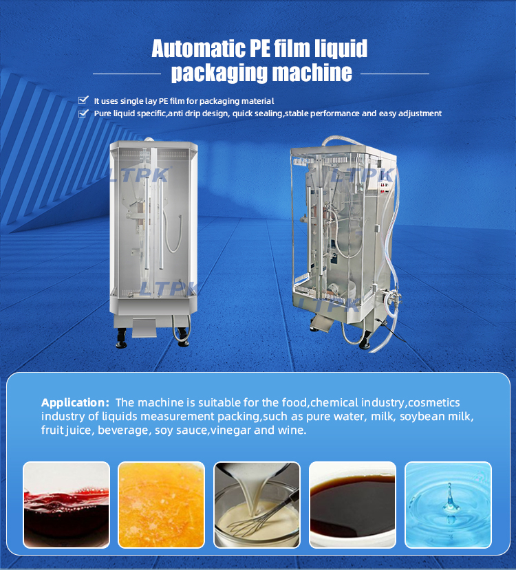 The machine is suitable for the food,chemical industry,cosmetics industry of liquids measurement packing,such as pure water, milk, soybean milk, fruit juice, beverage, soy sauce,vinegar and wine.