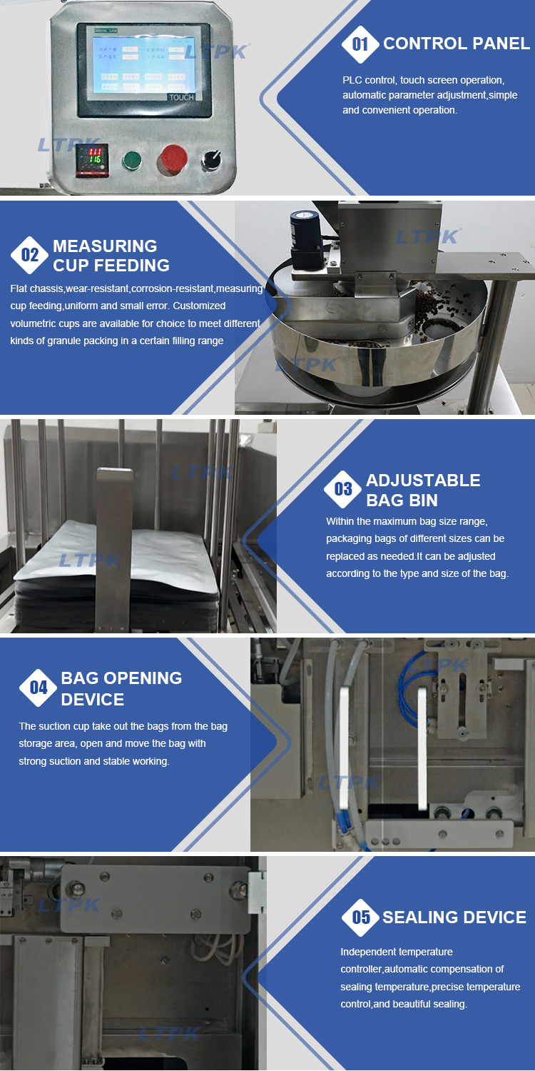 The pre-made pouch packing machine is automated packing equipment specifically designed for filling and sealing pre-made bags.It can be configured with different weighing methods depending on the material being packaged.It adopts touch screen operation, PLC control, automatic compensation of sealing temperature, precise temperature control,and beautiful sealing.