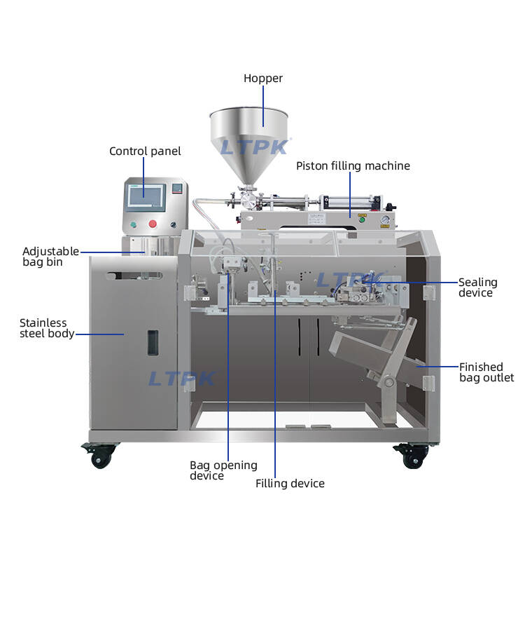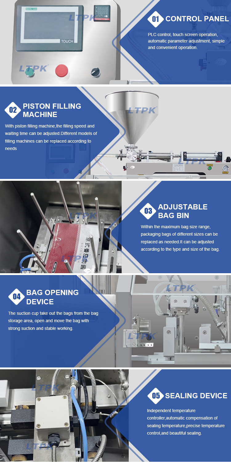 The pre-made pouch packing machine is automated packing equipment specifically designed for filling and sealing pre-made bags.It can be configured with different weighing methods depending on the material being packaged.It adopts touch screen operation, PLC control, automatic compensation of sealing temperature, precise temperature control,and beautiful sealing.