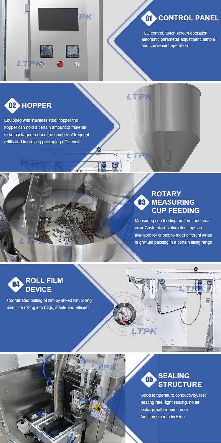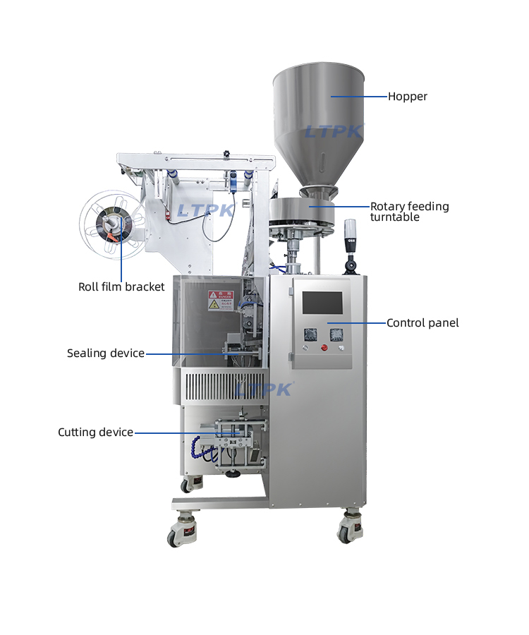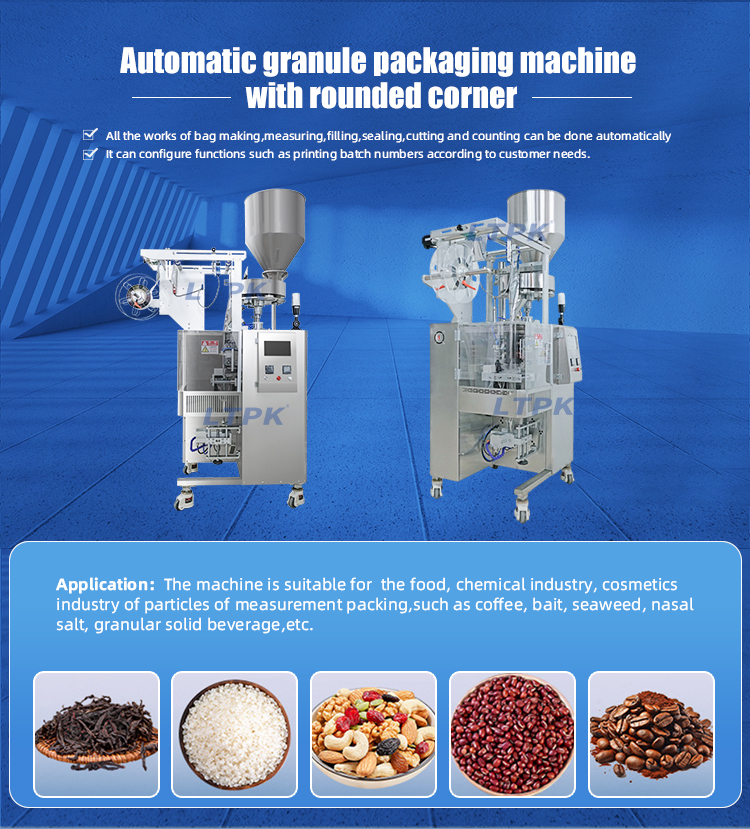 The machine is suitable for the food, chemical industry, cosmetics industry of particles of measurement packing,such as coffee, bait, seaweed, nasal salt, granular solid beverage,etc.