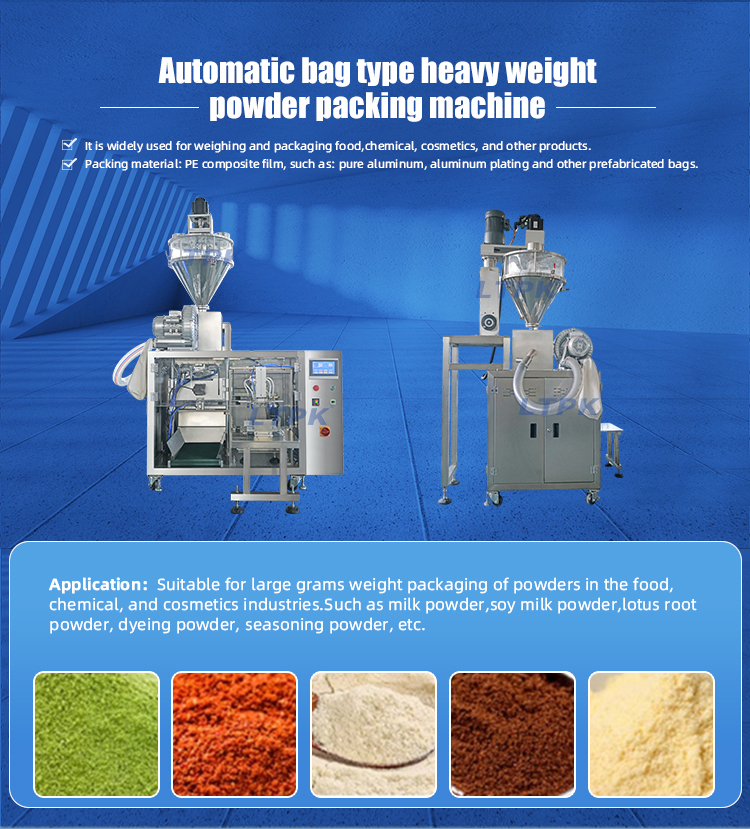 Suitable for large grams weight packaging of powders in the food, chemical, and cosmetics industries.Such as milk powder,soy milk powder,lotus root powder, dyeing powder, seasoning powder, etc.