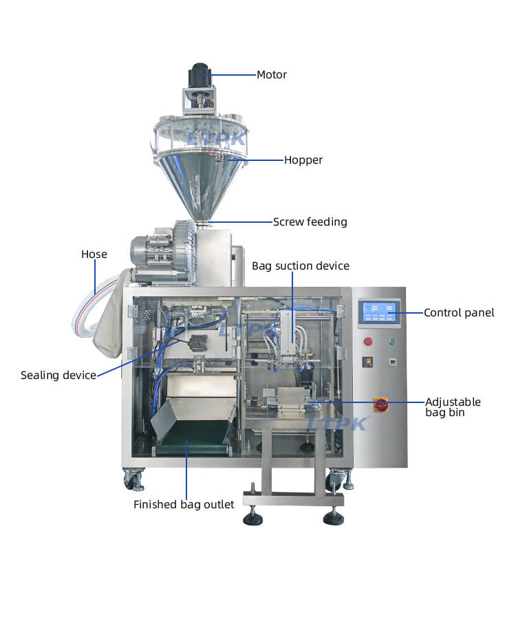 The pre-made pouch packing machine is automated packing equipment specifically designed for filling and sealing pre-made bags.The packaging process is fully automatic without manual operation. Different blanking structures can be selected according to the nature of the filling material.
