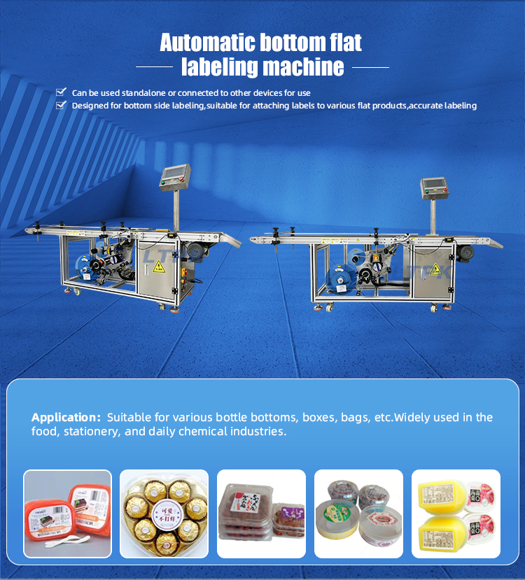 The automatic bottom flat labeling machine is suitable for flat labeling of various products. The advantage is that it can easily achieve flat labeling without flipping the front, and can be connected to other devices for use. Optional coding machine or inkjet printer can be used to print production date, batch number, barcode and other information on the label.
