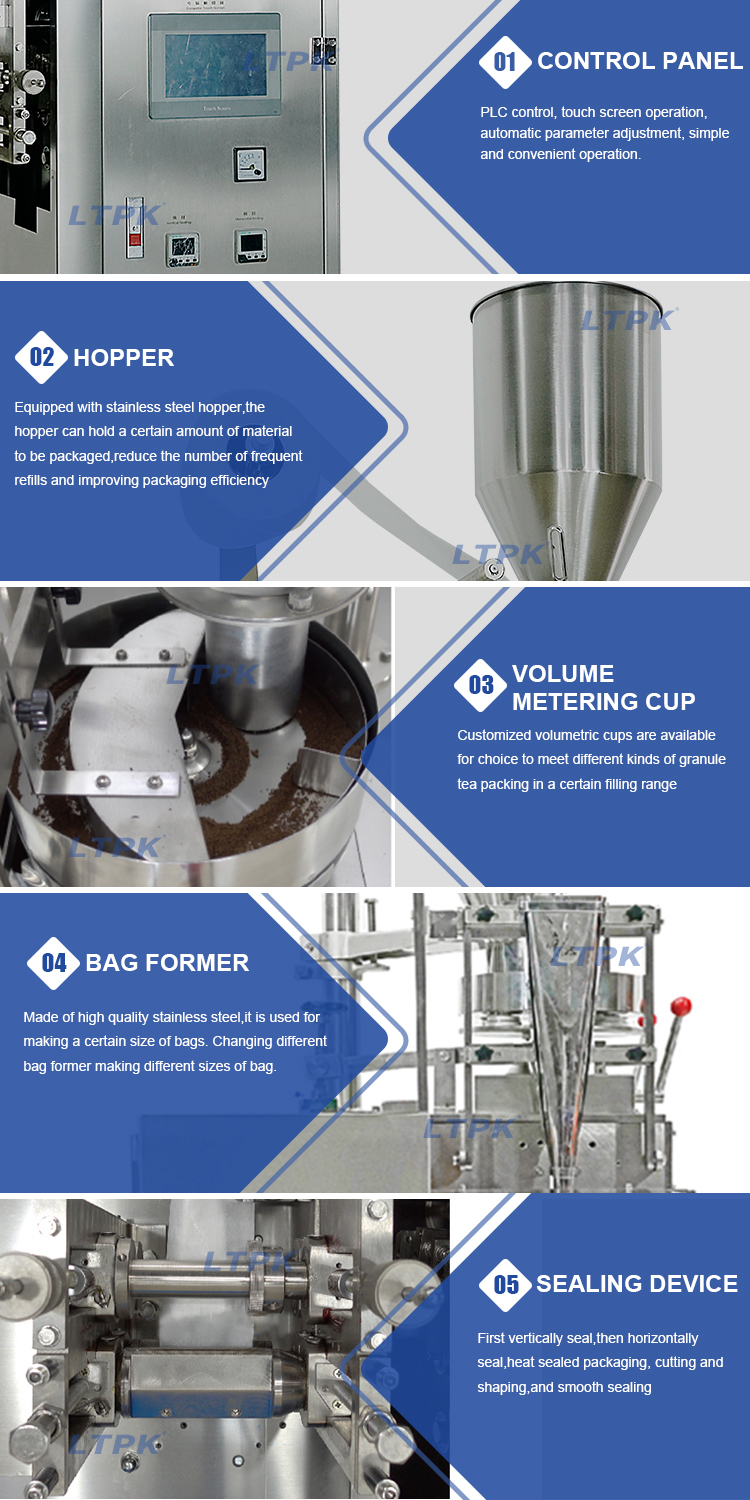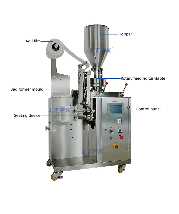 The machine adopts PLC control, touch screen operation, automatic parameter adjustment, and simple and convenient operation.Tea bag with the thread,it can automatically complete functions such as bag making,measuring, feeding, sealing, cutting, counting, etc.