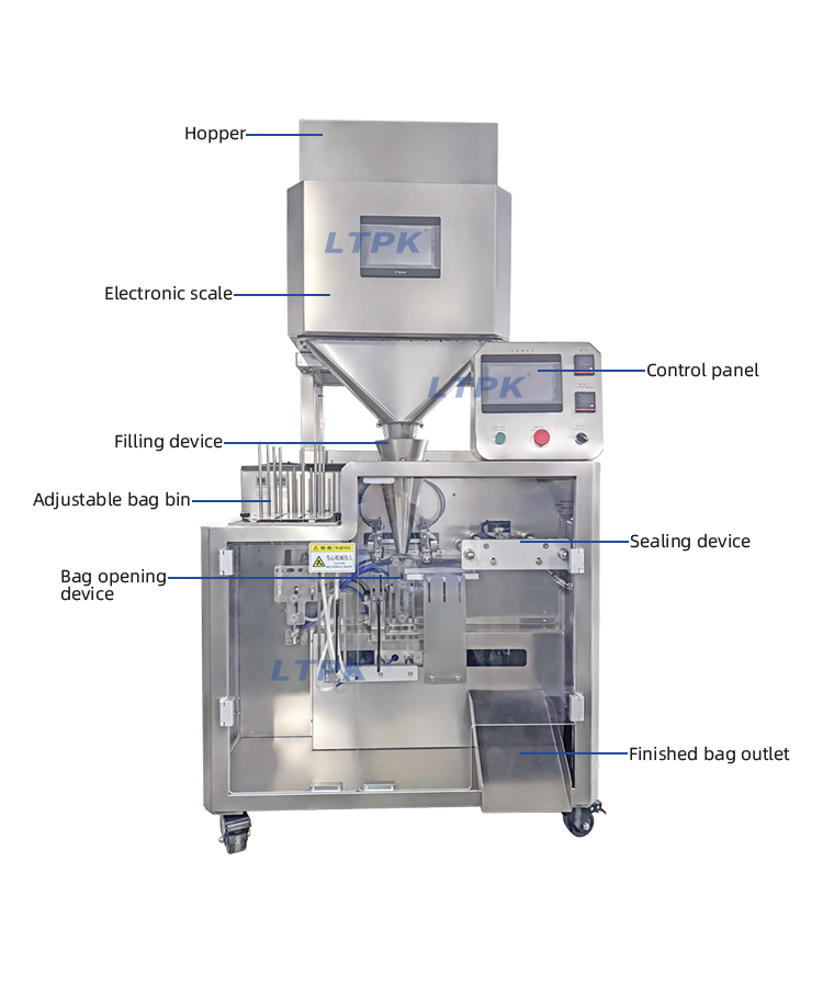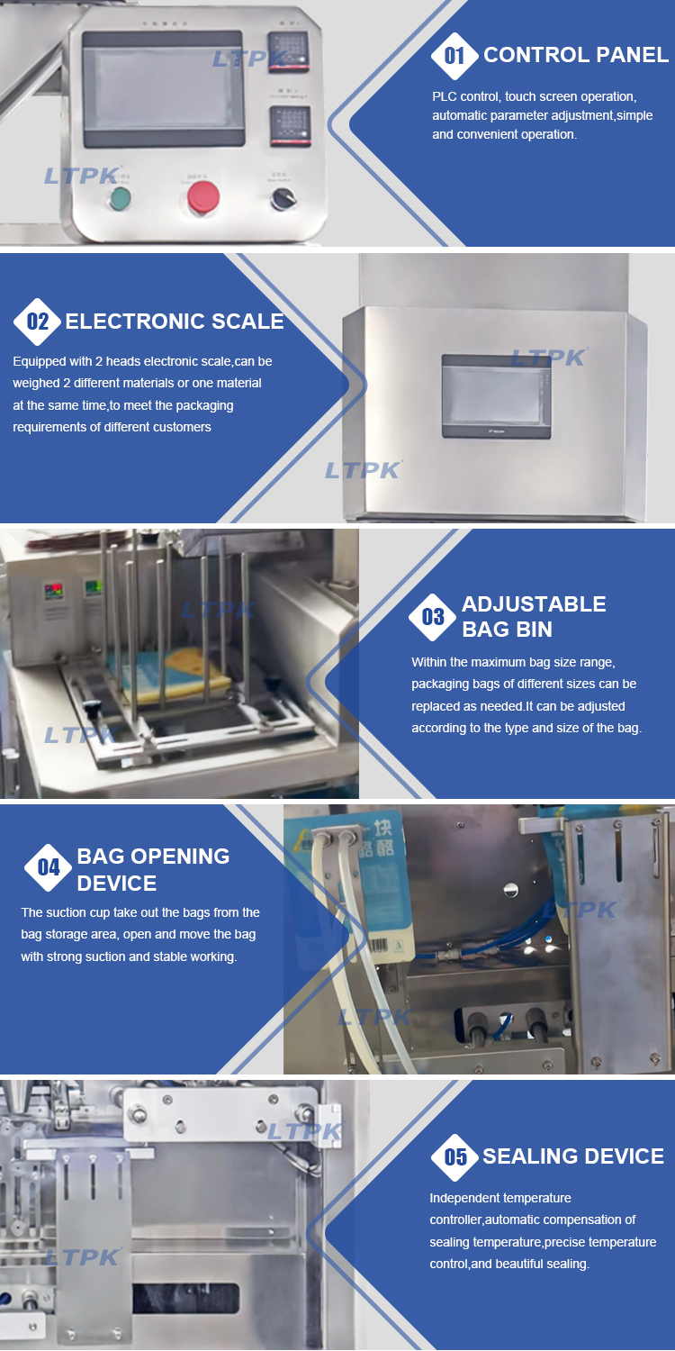 The pre-made pouch packing machine is automated packing equipment specifically designed for filling and sealing pre-made bags.It can be configured with different weighing methods depending on the material being packaged.It adopts touch screen operation, PLC control, automatic compensation of sealing temperature, precise temperature control,and beautiful sealing.