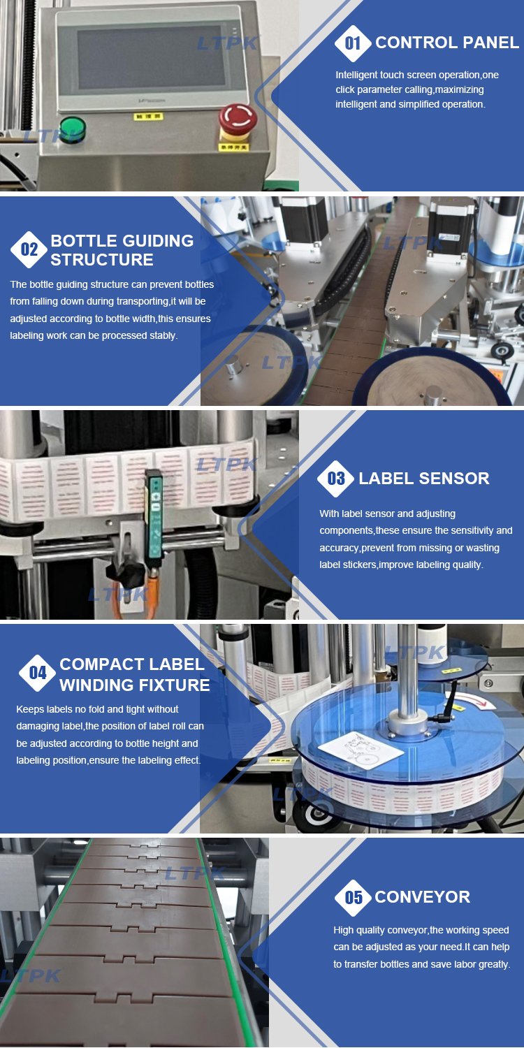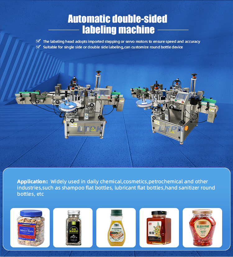The automatic double-sided labeling machine is suitable for single side and double-sided labeling of flat bottles, round bottles, and square bottles, with simultaneous labeling on both sides to improve production efficiency. Optional round bottle labeling mechanism to achieve half cycle/ full cycle labeling of round bottles. Optional coding machine and inkjet printer can be used to print production date, batch number, barcode and other information on the label.