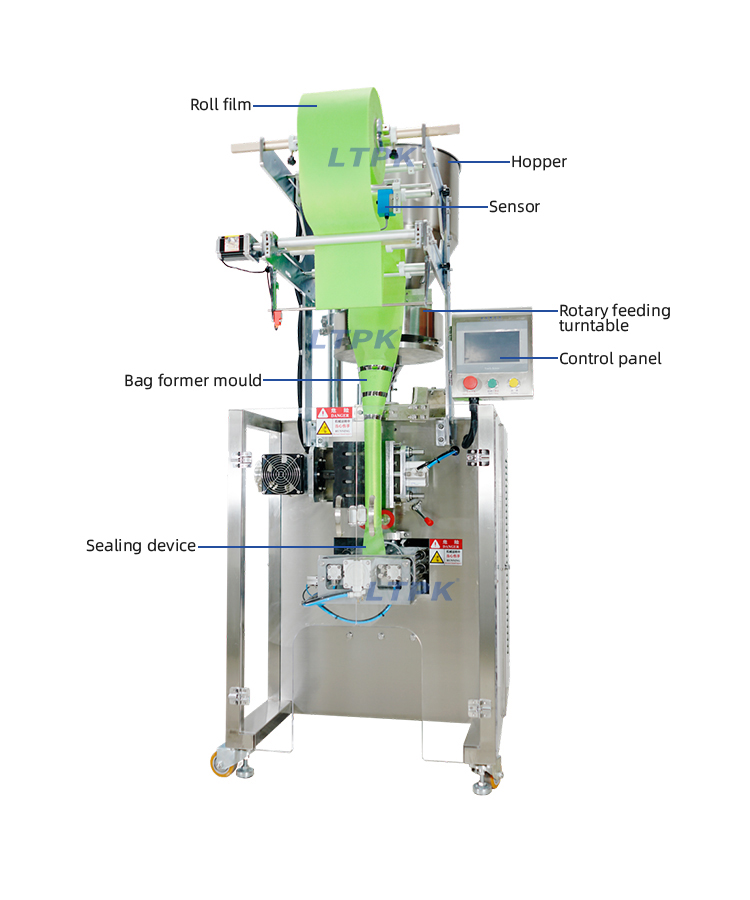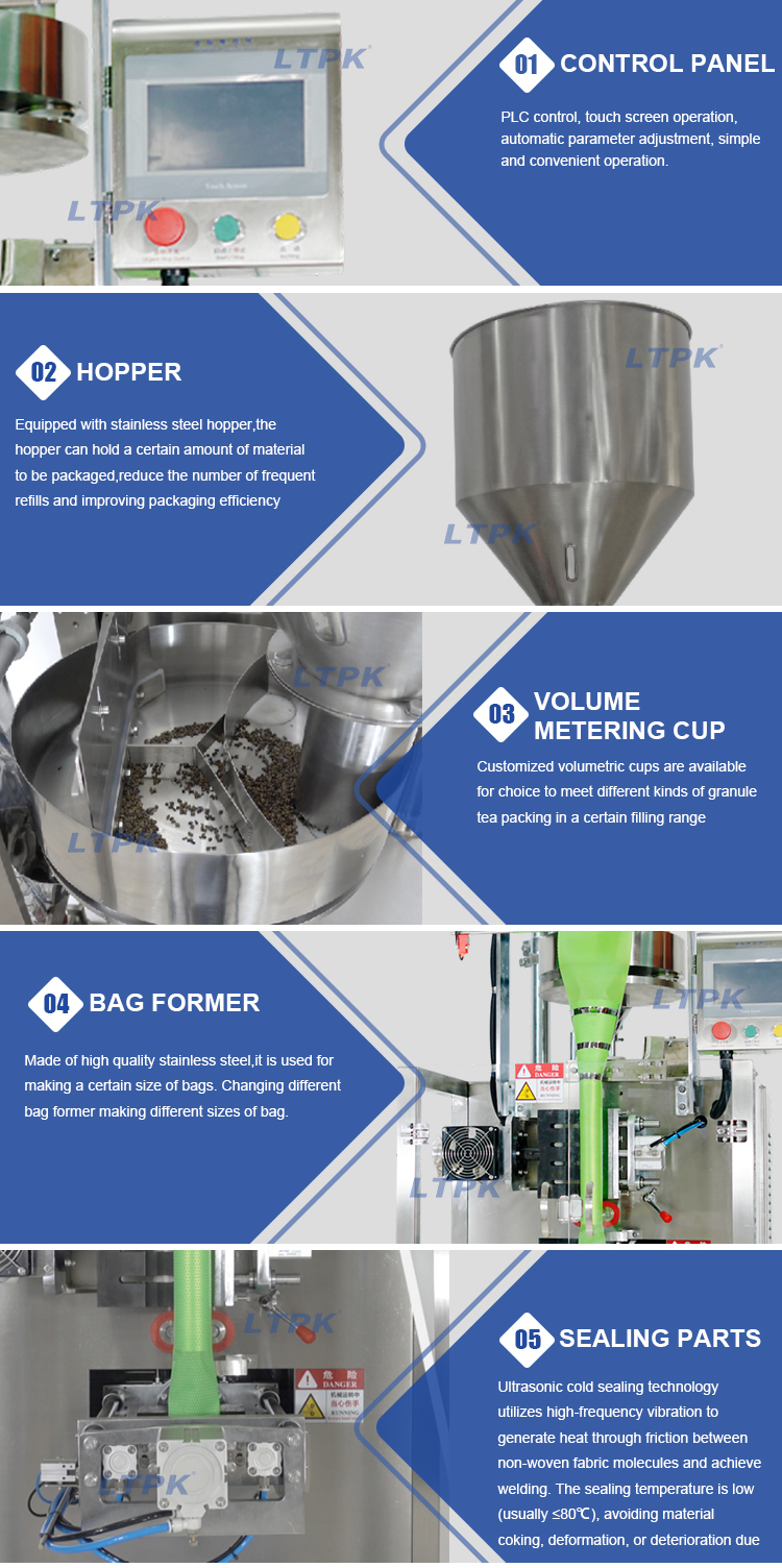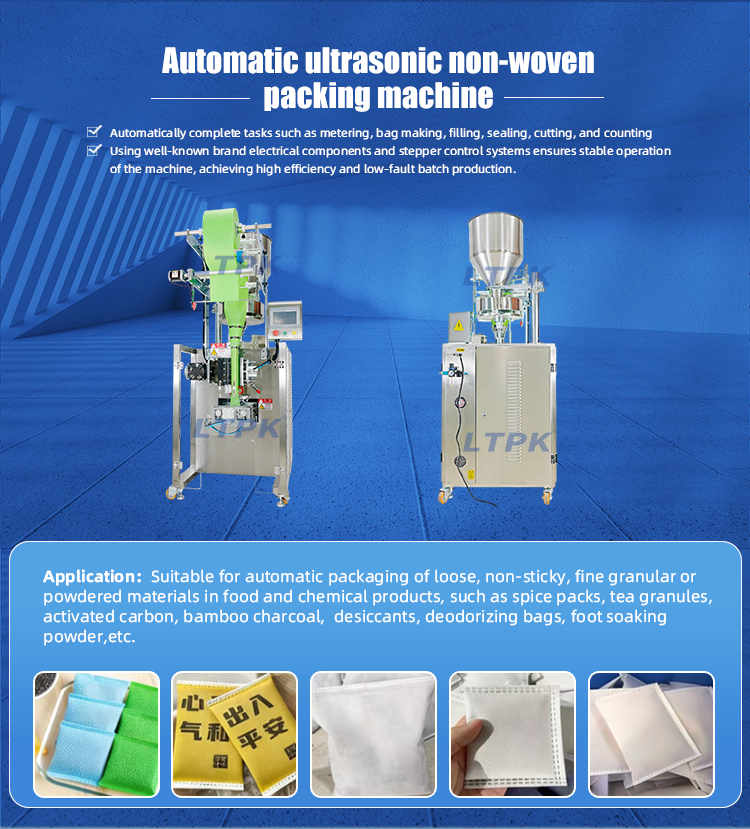 Suitable for automatic packaging of loose, non-sticky, fine granular or powdered materials in food and chemical products, such as spice packs, tea granules, activated carbon, bamboo charcoal, desiccants, deodorizing bags, foot soaking powder,etc.