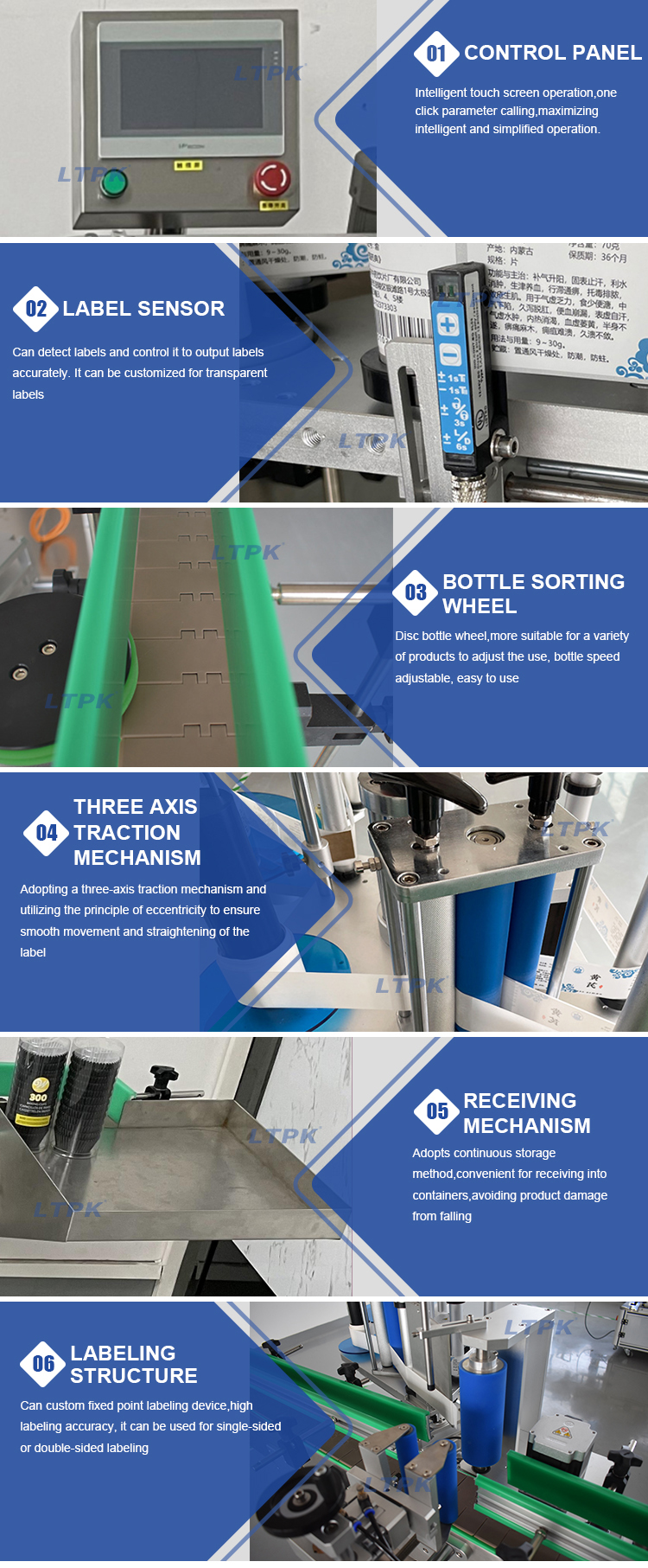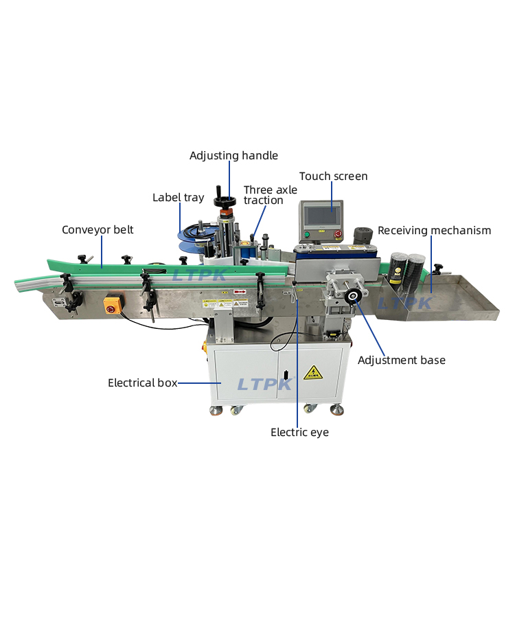Automatic vertical round bottle labeling machine is for glass bottles,plastic bottles and other cylindrical objects, tapered objects can be customized.Optional ribbon coding machine can print production batch number, date and other information on the label,achieving the integration of date printing and labeling, reducing processes and improving production efficiency.