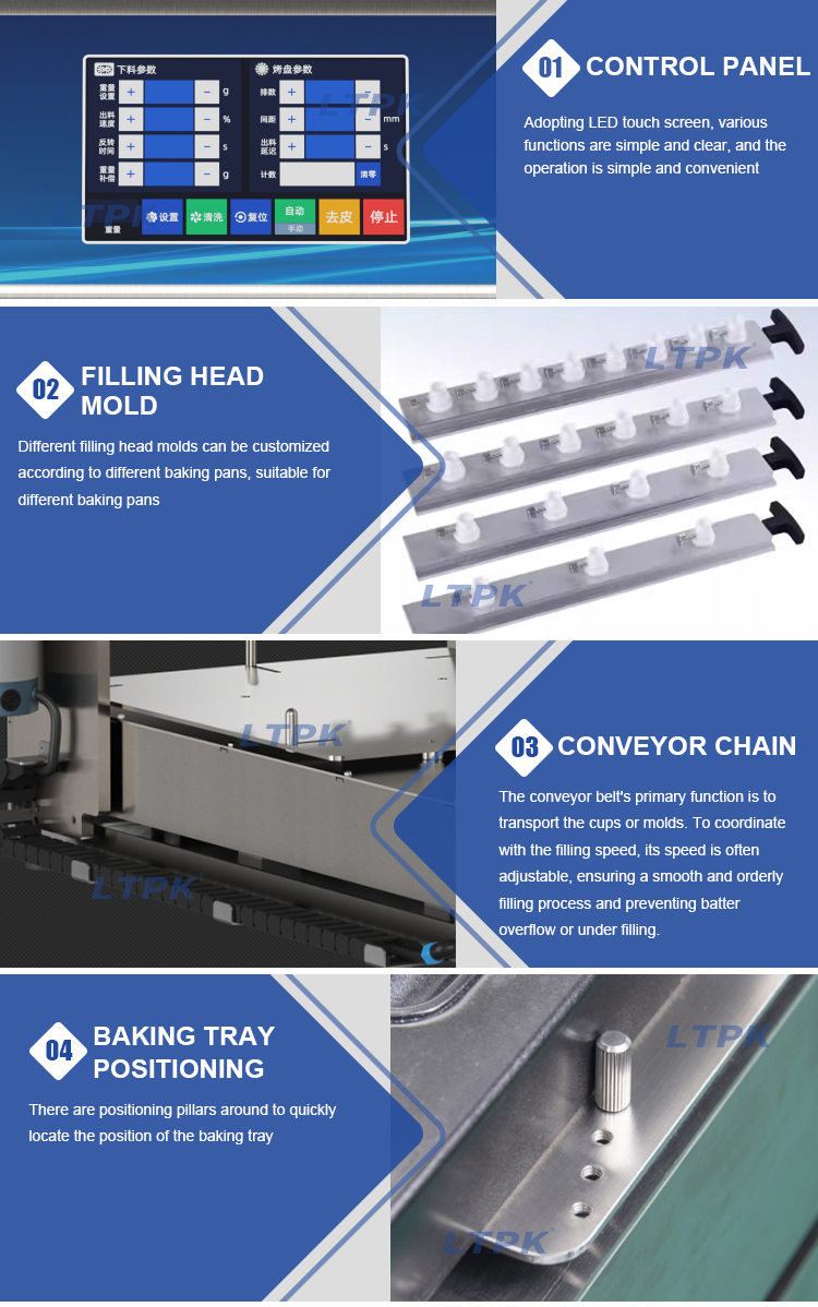 Cupcake filling machines are a widely used piece of professional food processing equipment in bakeries and food processing plants. Their core function is to dispense cake batter into paper cups or molds in fixed doses.The filling machine is equipped with an integrated industrial control touch screen that integrates touch sensing and intelligent control systems. It can accurately identify touch positions and operating instructions, enabling convenient and accurate equipment control.