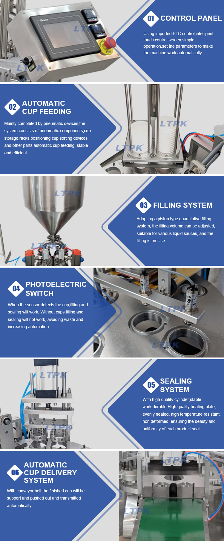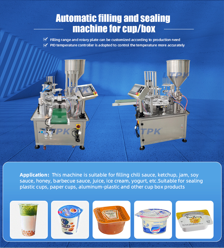 This machine is suitable for filling chili sauce, ketchup, jam, soy sauce, honey, barbecue sauce, juice, ice cream, yogurt, etc.Suitable for sealing plastic cups, paper cups, aluminum-plastic and other cup box products