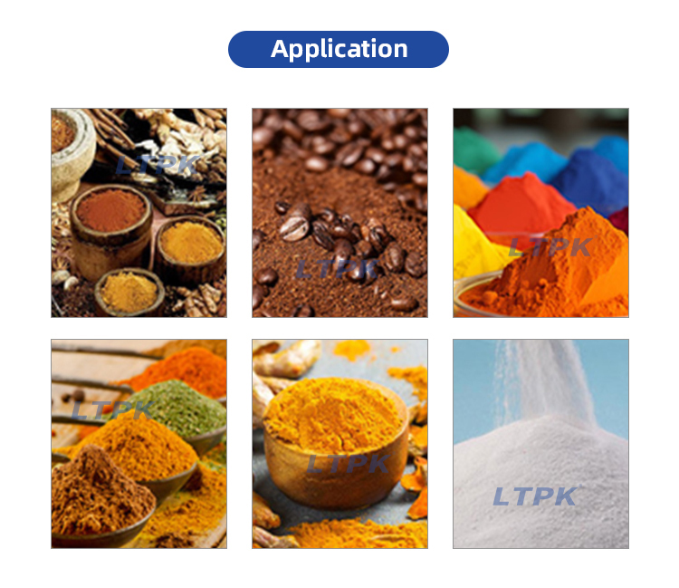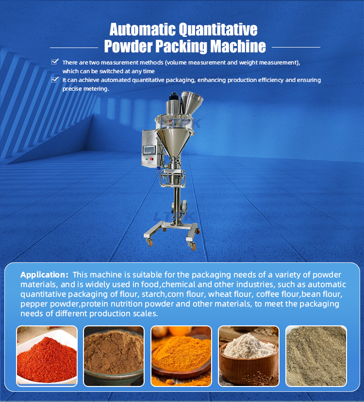 This machine is suitable for the packaging needs of a variety of powder materials, and is widely used in food,chemical and other industries, such as automatic quantitative packaging of flour, starch,corn flour, wheat flour, coffee flour,bean flour, pepper powder,protein nutrition powder and other materials, to meet the packaging needs of different production scales.