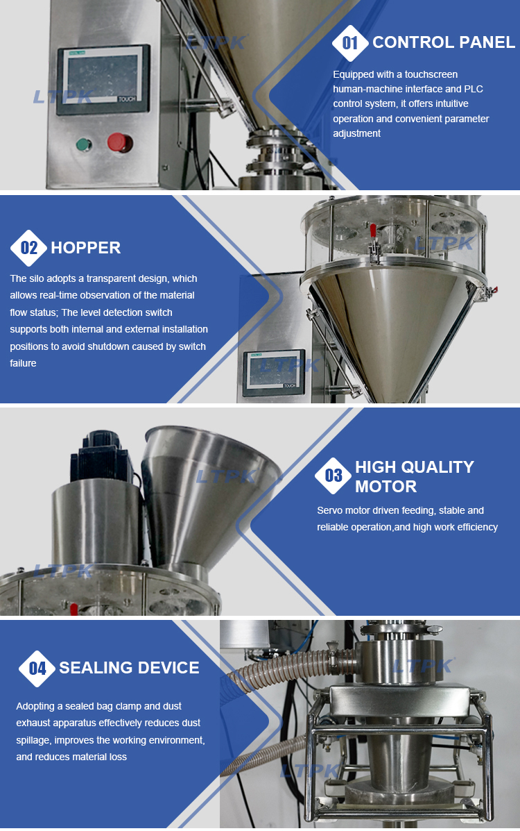 The machine adopts a stainless steel body and transparent silo design, with a touch screen control panel on the left side for intuitive and convenient operation; Supports dual mode switching between volume and weight measurement, with a packaging accuracy of up to 1 gram (under 1000 gram specifications) and a measurement range covering 1-25 kilograms, suitable for various powder materials
