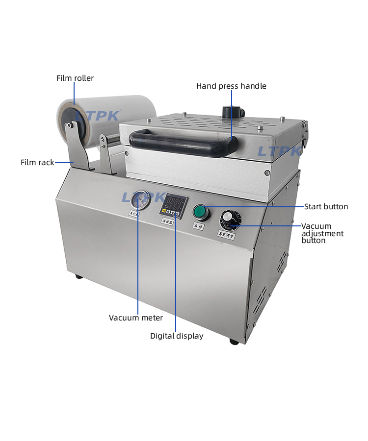 This equipment is a packaging machine specially designed for vacuum fitting of food boxes. It is mainly composed of chassis, film release mechanism (composed of film rack, film rolling roller and film walking roller), upper and lower vacuum chambers, molds, heating and temperature control system and electrical automatic control system.